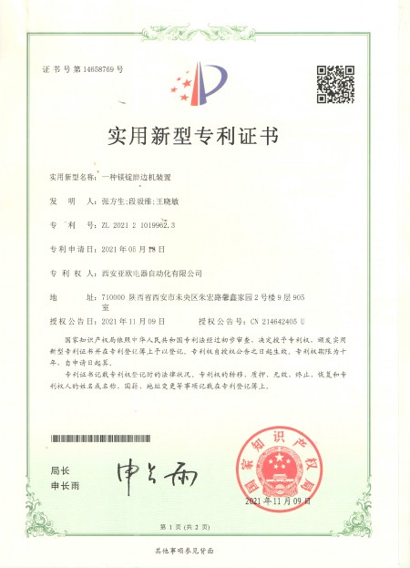 - 關于我們 - 資質榮譽 - 一種鎂錠磨邊機裝置專利